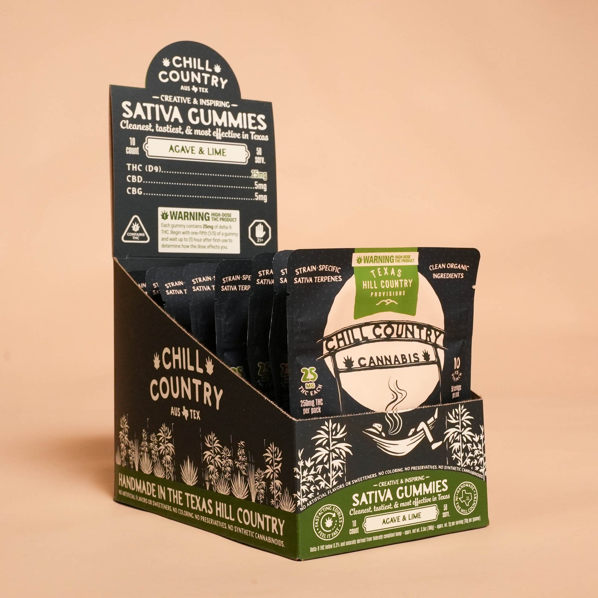 Each gummy contains 25mg of natural delta-9 THC, 5mg of CBD, and 5mg CBN + strain-specific sativa terpenes.