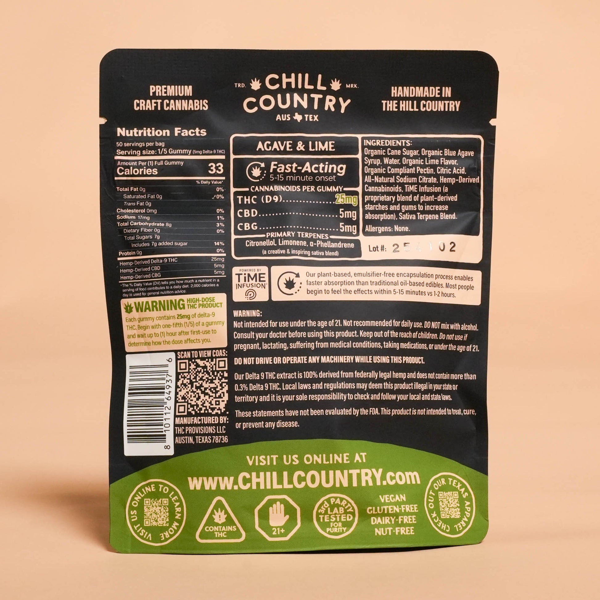 Ingredients: organic cane sugar, organic blue agave nectar, water, organic lime flavor, organic compliant pectin, citric acid, all-natural sodium citrate, hemp-derived cannabinoids, TiME Infusion (a proprietary blend of plant-derived starches & gums to increase absorption), terpenes.