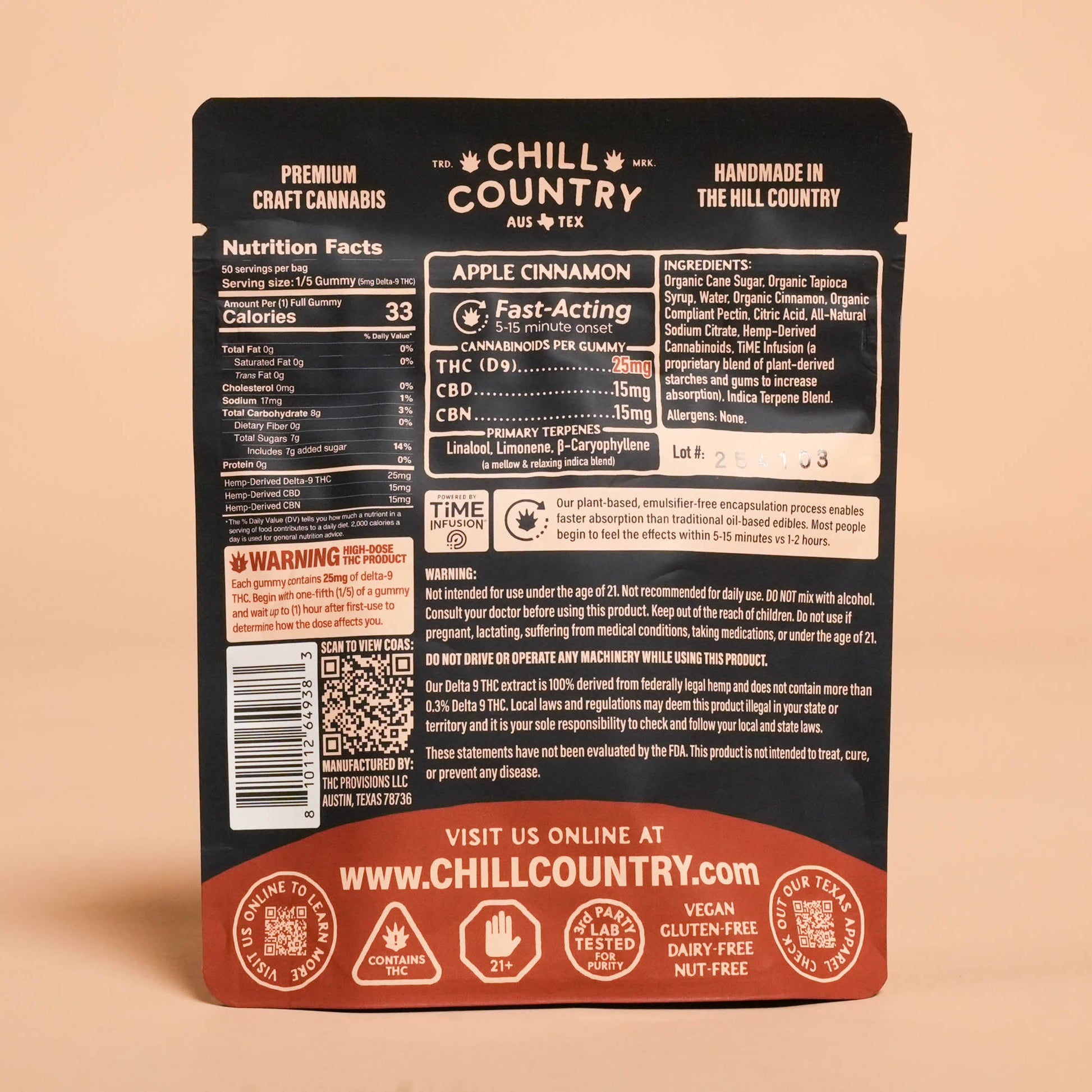 Ingredients: organic cane sugar, organic tapioca syrup, water, organic cinnamon, organic compliant pectin, citric acid, all-natural sodium citrate, hemp-derived cannabinoids, TiME Infusion (a proprietary blend of plant-derived starches & gums to increase absorption), terpenes.